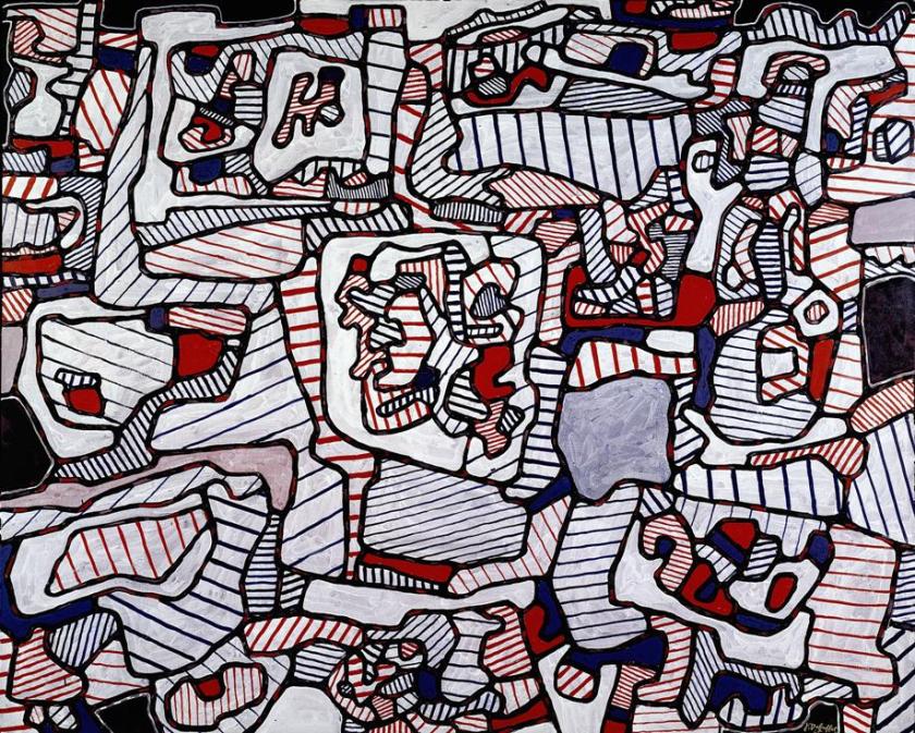On view here is a variety of wall-hanging paintings and three-dimensional sculptures, amounting to a mini-journey through his art. Much is black, white, red and blue in a cascade of colour blocks and lines, like frenzied cellular structures seen in brilliant primary colour. The materials are diverse: paint can be vinyl, acrylic, oil. The patterns are both crazy and rational, and the figures which emerge may be poignant, childish, chaotic, affecting, touching or frightening. Dubuffet, like Picasso, has made mainstream a deliberate and knowing, yet artless, direct and seemingly spontaneous childishness. His intensely original imagination is evident in his whirligig Site Inhabited by Objects, 1961 (main image): now you see them now you don’t.