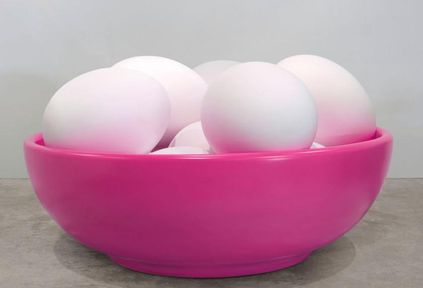 A huge, sugar-pink bowl filled with perfectly white eggs occupies one’s field of vision in gallery three (main picture). Gazing up at this absurd object, you feel like Goldilocks encountering Daddy Bear’s enormous bowl of porridge – trapped inside a fairy tale featuring a bewildering amount to eat.