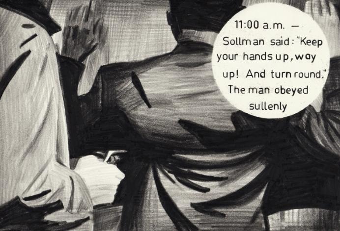 Working almost entirely in nero pencil, which gives a waxy yet deep sheen, an almost comic-book chiaroscuro, Van Eeden hitches his world to ours by use of archive photos and text, which he repurposes to be part of his story, removing all the names and specific indicators. His fictions occur in the real world yet embrace our fictions and the elliptical narrative that results reminds us that a story can be compelling both for what it says and what it hides. You follow the story from one picture to another, like a movie storyboard, but you must supply the missing scenes.
