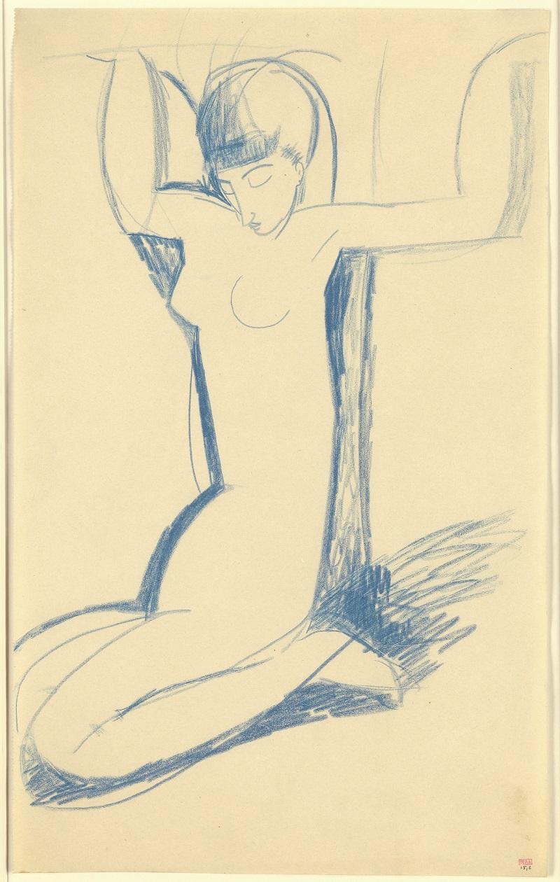 A drawing like Female Nude with Wing-like Arms (recto), c1910, anticipates his characteristically elongated style, the monolithic figure constructed from a series of arcs. There are no superfluous marks here, and the blank, mask-like face has taken its cue from the simplified representations typical of Egyptian and African art.