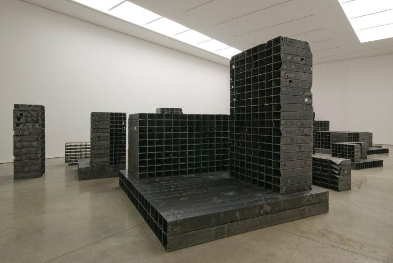 Bunker (main picture) in the basement takes on more of a life of its own, recreating 23 bombed-out Beirut buildings in stacked sections of rectangular mild steel tubing – a material that looks anything but mild in this context. The cuboid Modernist structures spattered with bullet hole-like borings, gougings and serrations create a brutally ominous cityscape in the specially dimmed light. The forms are large enough – at up to 15 feet high – for you to walk among them feeling at once oversized and overwhelmed, as though through some blasted model village. From some angles these structures look almost transparent, from others oppressively dense and massive, their less-is-more geometry evoking not only the hammering of once-elegant Beirut, but some graveyard of the Modernist spirit – alluding perhaps to that movement’s manifest failure to create a more humane world.