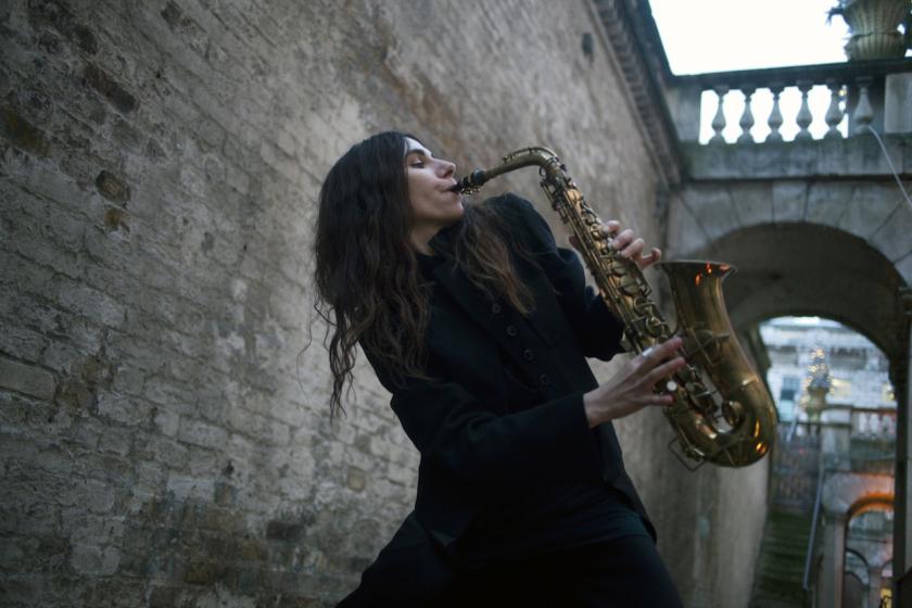 PJ Harvey has talked in an interview with Michael Morris about the installation being a kind of sculpture. This makes sense in terms of the carefully arranged setting – at once familiar and awe-inspiring: the tools of the trade that make up Harvey’s increasingly sophisticated musical world, every breed of saxophone from soprano to baritone, a fluegelhorn, a bass clarinet, two auto-harps, various drums and percussion instruments, a rickety-looking upright piano, an accordion, a battery of guitars and an exotic hurdy-gurdy.