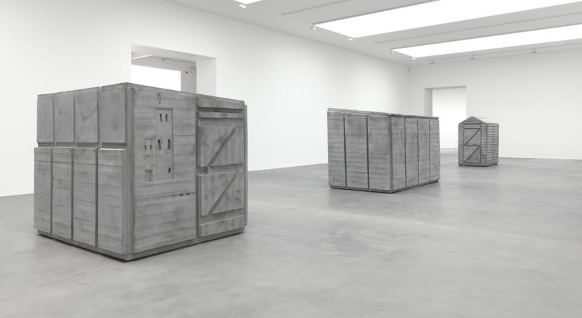 The sheds didn’t have to wait long for her attention. Three of them now stand proudly ensconced in the Gagosian Gallery; not the sheds themselves, of course, but concrete casts of their interiors. Thanks to the casting process the structures have undergone a profound change; warm wood is replaced by cold, grey concrete and positive or negative space is transformed into its opposite, so that door handles become recesses and windows protruding rectangles. This transforms the amiable old originals into bunker-like enclosures that exude an aura of industrial anonymity – closed cells permanently sealed in sullen hostility.