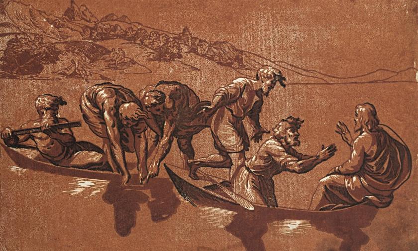 The painter and woodcutter Ugo da Carpi introduced chiaroscuro woodcut to Italy, and it was he who unlocked the painterly qualities of the form, recognising that the tone block could have a purpose beyond complementing the lines of the key block. Ugo’s print after a drawing by Raphael, The Miraculous Draught of Fishes, 1523-27 (main picture), uses three blocks; the two tone blocks use gradations of red, one of which is boldly printed across the entire sheet, while the black is kept to a minimum, providing accents and occasional areas of deep shadow. Bright white highlights add to the sense of movement and vigour, and the print has all the immediacy and panache of a sketch.