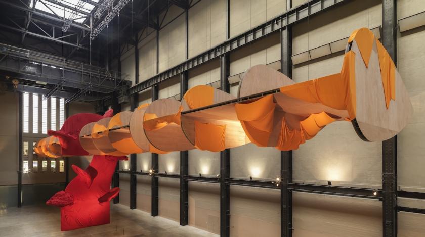 It could be an aircraft, hastily covered with some very inadequate wrappings and squeezed into the great hangar of the Turbine Hall. Or perhaps an eccentric sort of bird, its bedraggled wings missing chunks of orange plumage, in contrast to its plush, red body. Or perhaps it is part of a stage set with extravagant swags of red fabric carefully arranged to look, fleetingly, like theatre curtains, or pieces of scenery either under construction or partially wrapped, ready to be put away.