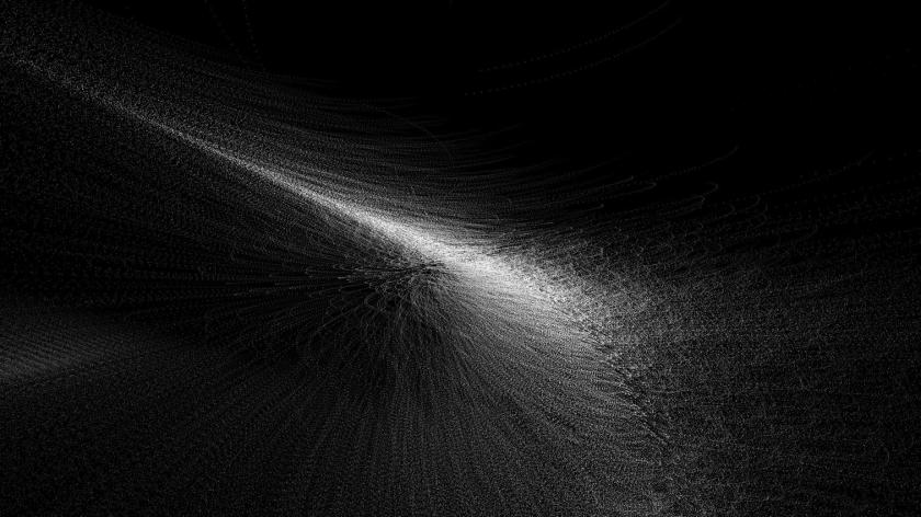 Three rows of video screens – a huge stage-width rectangular one at the top, with two rows of 10 smaller screen below – show images at breakneck speed. Some look like molecular diagrams, revolving around invisible poles; others look like shards of firing synapses or exploding super novae drawn out by computer-aided design; but most of all, superposition – as so much of Ikeda’s work – is about data – data as a remorseless onslaught on human senses, a continual flow of digital information.