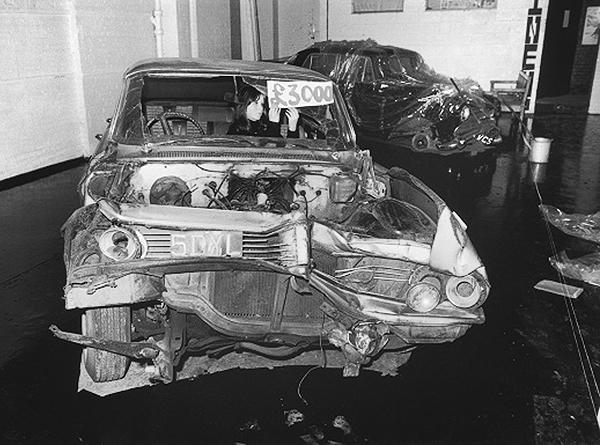Ballard responded by making collages himself, connected to themes that were beginning to preoccupy him in his writing. Much later, in 1970, no doubt with Warhol's Car Crash screenprints of the early Sixties fresh in the mind, he organised an exhibition of crashed cars at London’s avant-garde New Arts Lab, simply called "Crashed Cars". The crushed vehicles were displayed without commentary and, as might have been anticipated, excited outraged responses and acts of vandalism. His novel Crash, in which the dark erotic impulse is tied to the pursuit of death in a car crash, followed in 1973.