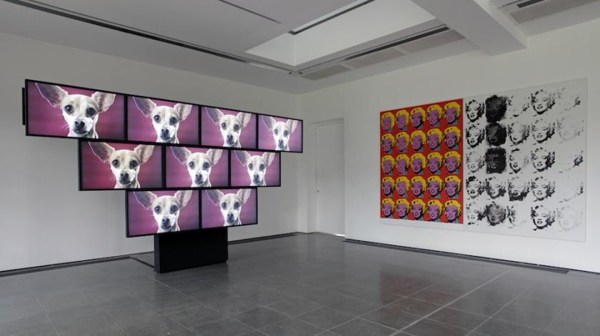 But other references were swilling around inside my skull. For instance, the dolls might refer to Paul McCarthy’s scurrilous forays into simulated sex and violence. The American artist enacts absurdly over-the-top scenes of sodomy, mutilation and murder using rubber gloves, artificial limbs and copious amounts of tomato ketchup. Snippets of his films appear in Sturtevant’s nine-screen video extravaganza, Elastic Tango (2010) alongside clips of running dogs, cuddly toys, mushroom clouds, a hooting owl, the American flag, a waving Mini mouse and Duchamp’s spinning wheels. Repeated into mesmerisingly beautiful patterns, they lull you into an acquiescent stupor, so you no longer care whether they mean anything or not.