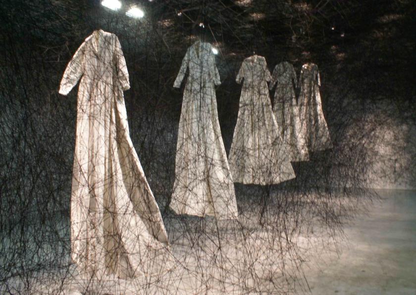In such a light as this, even the Chapmans’ tar-faced, darkly comic Nazis took on a more serious mood. And works that elsewhere could evoke and embrace a whole multitude of meanings here throbbed with particularity. Berlin-based Japanese artist Chiharu Shiota’s After the Dream (main image) featured a receding line of long white dresses afloat in the middle of a darkened room and entwined in a complex cat’s cradle of black cotton. The imprisoning taut black threads resembled both barbed wire and frenzied pencil-marks in the act of scribbling out. One could make a direct connection between this work and Louise Bourgeois’s Cells, some of which could be seen elsewhere in the biennale. Yayoi Kusama’s installation Footprints to the Future, was also bought to mind, her obsessive psychedelic dots threatening to obliterate a whole room.