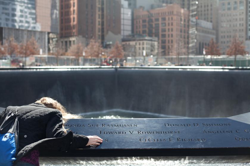 "Please do not throw or place anything in the memorial pools," say blue signs. I walk round the rim, reading the names. Robert Curatolo, from Ladder 16. Dana R Hannon from Engine 26. Lauren Catuzzi Grandcolas and her unborn child on Flight 93. Schoolkids too young to remember the attacks wave their phones around and take pictures, their voices carried away by the sound of the water. I sit on a cold stone bench and look at the lines of small bare trees, swamp white oaks, planted on strips of brown grass marked with more signs saying: "The lawns are closed for the season". Eventually 400 trees will be planted but that looks a long way off. Somewhere there’s a pear tree that survived the attacks, but I can’t find it.
