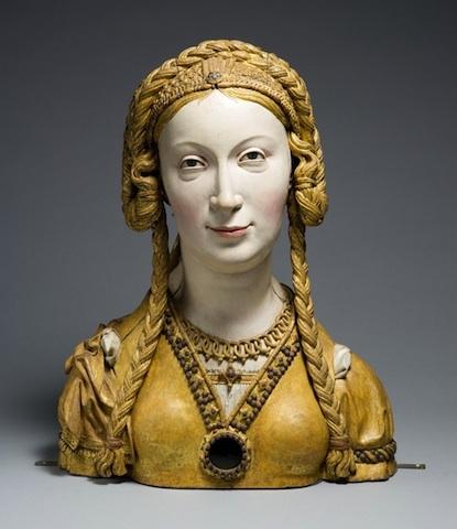 St Ursula was a fourth-century British believer who supposedly embarked on a pilgrimage with 11,000 virgins, all of whom were massacred in Cologne where their bones are to be found in the Basilica of St Ursula. Made from painted wood, busts portraying the young women often contain skulls of the deceased.