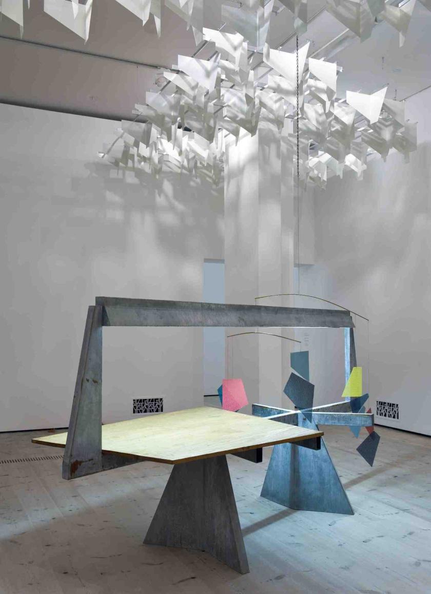 But what the work overhead reminds me of most of all is the reflecting, intricately geometric constructions of English artist Mary Martin, who often used mirror surfaces for her repeating forms. In fact, Boyce’s work as a whole contains a multitude of references to, and riffs on, other artists, including Caro and Calder in a sculpture inspired by a Modernist design for a table, but which could also, at a stretch, represent a piece of colourful playground equipment, and Frank Stella and the Boyle Family in a concrete wall panel. In fact, there are so many elements to this display that it keeps on delivering long after you’ve left the room; the more I think about it the more I find to like and the cleverer I think it is.