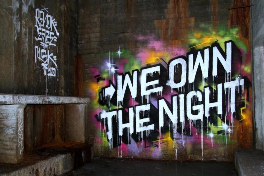 There is an expected amount of anarchic sloganeering and sly digs at the corporate-commercial complex. “WE OWN THE NIGHT” blares one painting on an end wall in italicised upper case. Another is plastered in a woozy, zig-zagged Stars and Stripes banner. One artist in the throes of a break-up deposited his dreams of moving home on the wall in the cartoon form of a walking house.