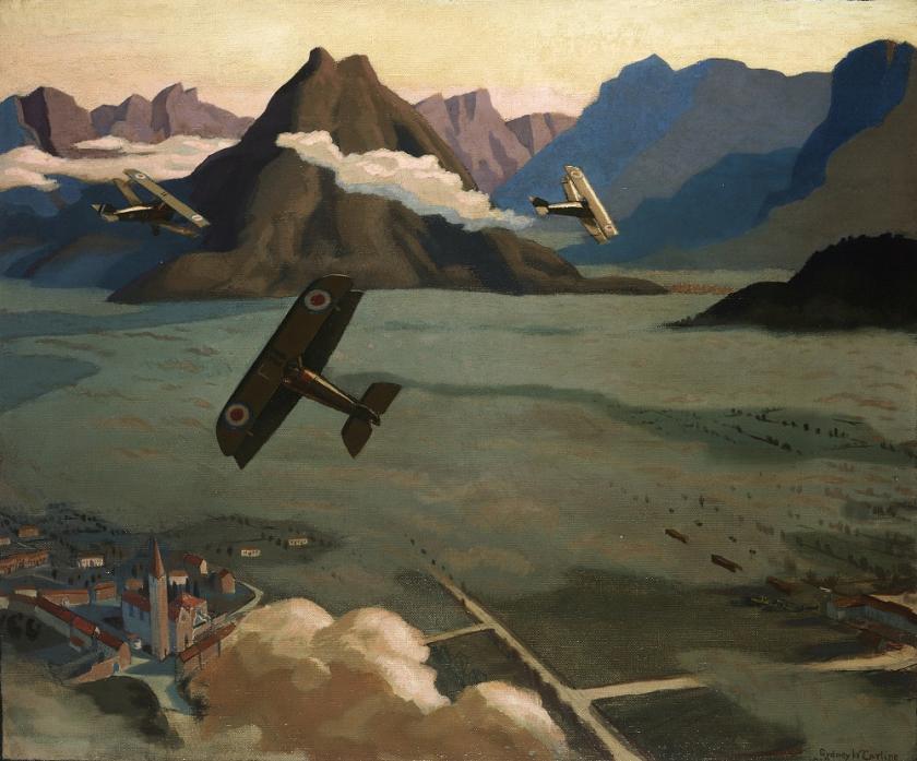 Sydney Carline first served his country as a pilot. He had already flown on secret reconnaissance missions in Italy in 1918 before being appointed an official war artist. His primary role was to record the heroic deeds of the newly formed RAF and their jewel in the crown – the Sopwith Camel. Military higher-ups must have been delighted with showpiece paintings like British Scouts leaving their Aerodrome on Patrol, 1918 (main picture).