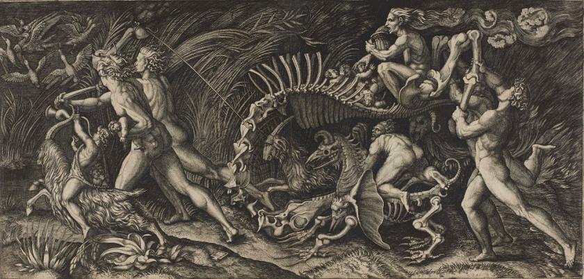 Many of the earliest images seen here cast witches as terrifying crones, as in Veneziano’s engraving The Witches’ Rout (c.1520, main picture) in which a muscular and ghastly old woman rides on top of a curiously animated skeleton. In Mantegna’s Battle of the Sea Gods, c.1470-1500, a similarly monstrous female presides over the scene. A second working of this subject, also by Mantegna which sometimes serves as a companion to this print, is not included in the exhibition, but a comparison of the two demonstrates the dramatic impetus added by the snarling old woman, who, motivated by envy, supposedly that most female of sins, has inspired this raging battle.