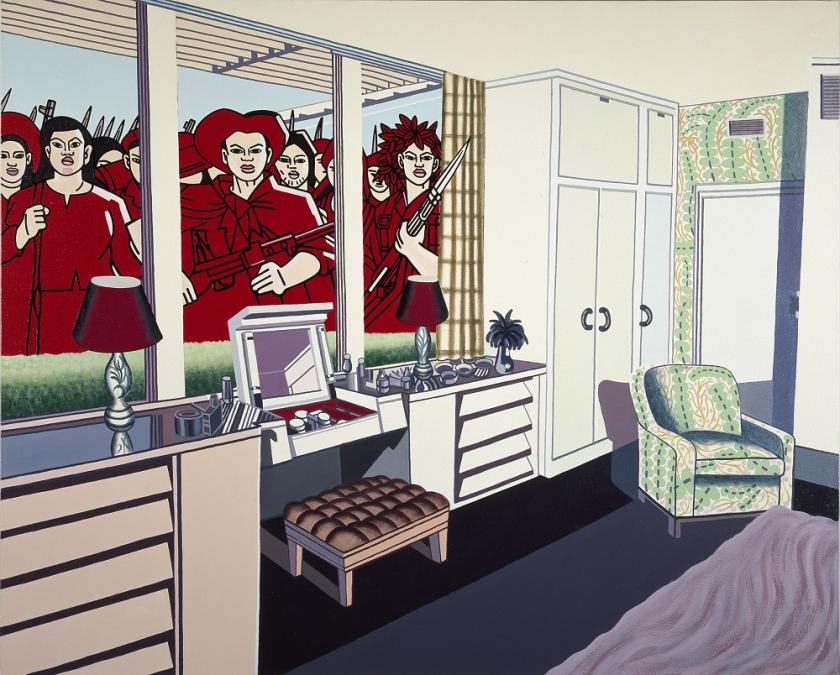 The Vietnam war provided a rich seam of material with which to both criticise and lampoon America, and while America cast itself as the land of the free, an artist like Erró suggests that irrational fears concocted by the media, amounted to a form of mind-control every bit as pernicious as that practised by totalitarian states. In American Interior No. 1, 1968, comic-book Maoist troops gather outside the window of a peaceful suburban home (main picture), while elsewhere in the series, Vietnamese intruders have already gained access to the house.