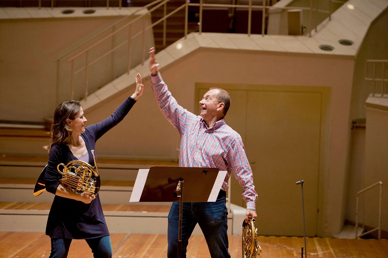 I would love to be able to say that there is some deep philosophical meaning why I chose all these pieces to record together, but the truth is that I wanted new pieces and was lucky that I love all of these. I was sure the horn world would be happy to include them in their repertoire. The bluesy Song of a New World by Richard Bissill [principal horn of the Orchestra of the Royal Opera House] is a real technical challenge but so much fun to play. It is such an honour to have a piece written especially for me, and what a piece it is! David Riniker´s Romantic Trio arrangements are good for the soul and suit the horn sound perfectly and they are all pieces everyone knows and loves. Klaus Wallendorf´s Willisabethan Sarahnade is a real piece of my life history – and Klaus is my favourite duet partner of all time (Klaus Wallendorf pictured above with Sarah Willis) – and the Mason Bates Mainframe Tropics is a very cool piece which challenges both musically and technically. I actually felt that I had the easiest time of the three of us in the Bates piece – Kotowa and Philip (Kotowa Machida and Philip Mayers pictured below with Sarah Willis) have incredibly difficult parts, and played them amazingly well.