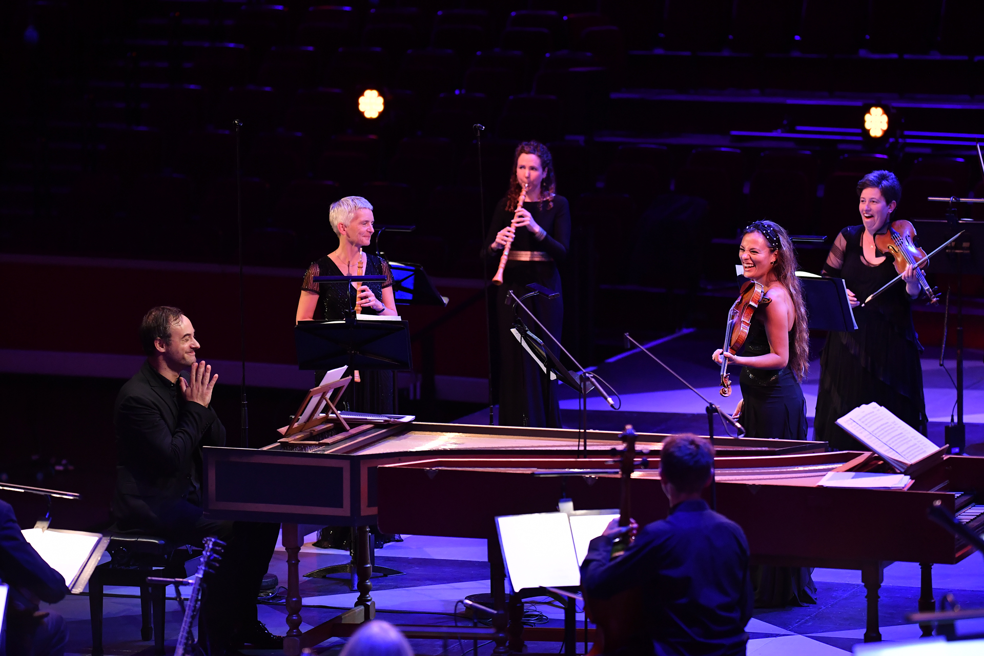 As an orchestral interlude, the mighty Passacaglia from Handel’s opera Radamisto lent Cohen and his forces another chance to showcase their strength in depth. Here the physical separation mandated by the rules turned out to be a blessing of sorts, as the spacious grandeur of the descending figures gave each instrumental voice a chance to shine in its splendid isolation. But close-quarters dialogue mattered vitally in the Vivaldi A minor Concerto for Two Oboes that followed, and the soloists – Katharina Spreckelsen and Sarah Humphrys (pictured above with Nicola Benedetti and Kati Debretzeni) – talked (or rather sung) together with winning intimacy. I had feared that the bittersweet delicacy of the Baroque oboe might disappear into the vacant cavern of the Hall. But the pair drew on strength as well as subtlety, with an intertwined beauty of line that made the lilting largo a magical suspension of space and time.