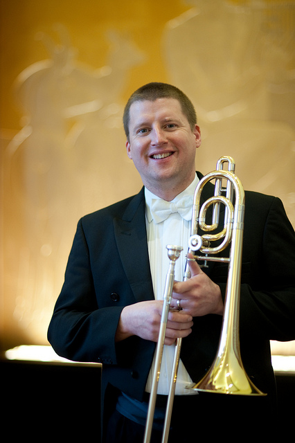 He was joined, in exactly the same fashion, by Simon Cowen (pictured right), the RLPO’s principal trombone, and the two sparked off each other, sometimes competing for the limelight, at other times growing intimate. At the end, as the piece died away to nothing, Lindberg inserted the mute into the bell of the other trombone and gradually covered it with his hand, thus allowing the sound to fade to nothing.