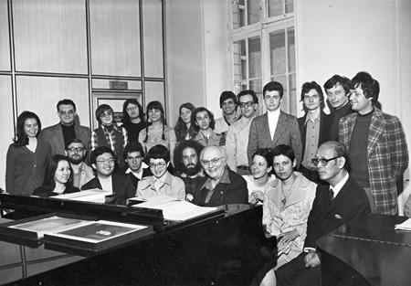 A six-year-old George Benjamin can be seen smiling bashfully next to Olivier Messiaen (centre)