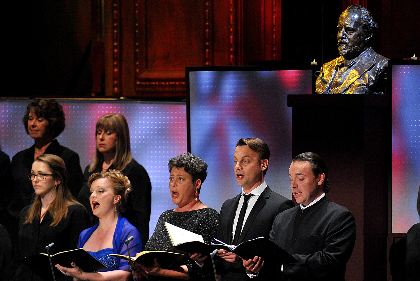 The final movement with lower strings flawlessly energetic, and later with soloists and chorus in fine balance (Lucy Crowe, Gerhild Romberger, Pavel Černoch and Kostas Smoriginas with some of the choristers and Henry Wood pictured right), again showed the strengths of Nelsons's approach. He knows precisely how to get the best out of an English amateur chorus, by extracting each and every syllable from their mouths. They even got a jokey visual aid for the word "Götterfunken". The first involvement of the solo quartet, placed in the chorus at the back of the stage, prompted the only brief moment of tempo-uncertainty in the whole symphony.