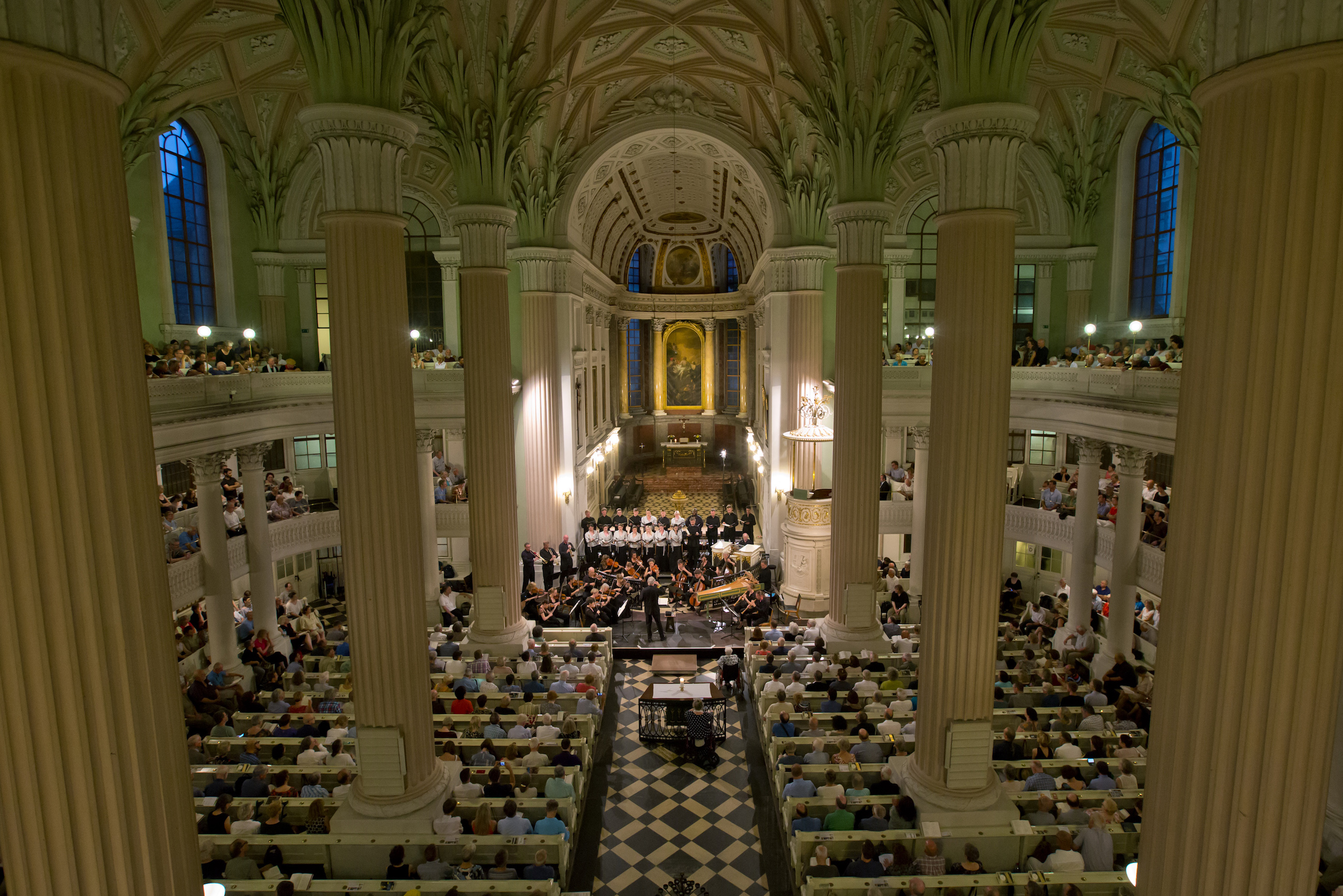 St Nicholas’s (below), which was also Bach’s responsibility, was given a neoclassical makeover after his death, and though it retains its galleries (on two levels, almost like a theatre), it no longer feels like the baroque interior in which his St John Passion was first performed in 1724. Less cramped than St Thomas’s, it provides enough space at the east end for the relatively large forces of Bach’s more ceremonious cantatas, while its tall pink and white fluted columns and exaggerated corinthian capitals seem worlds away from the protestant severities one associates with even the more ornate elements of Bach’s church music.