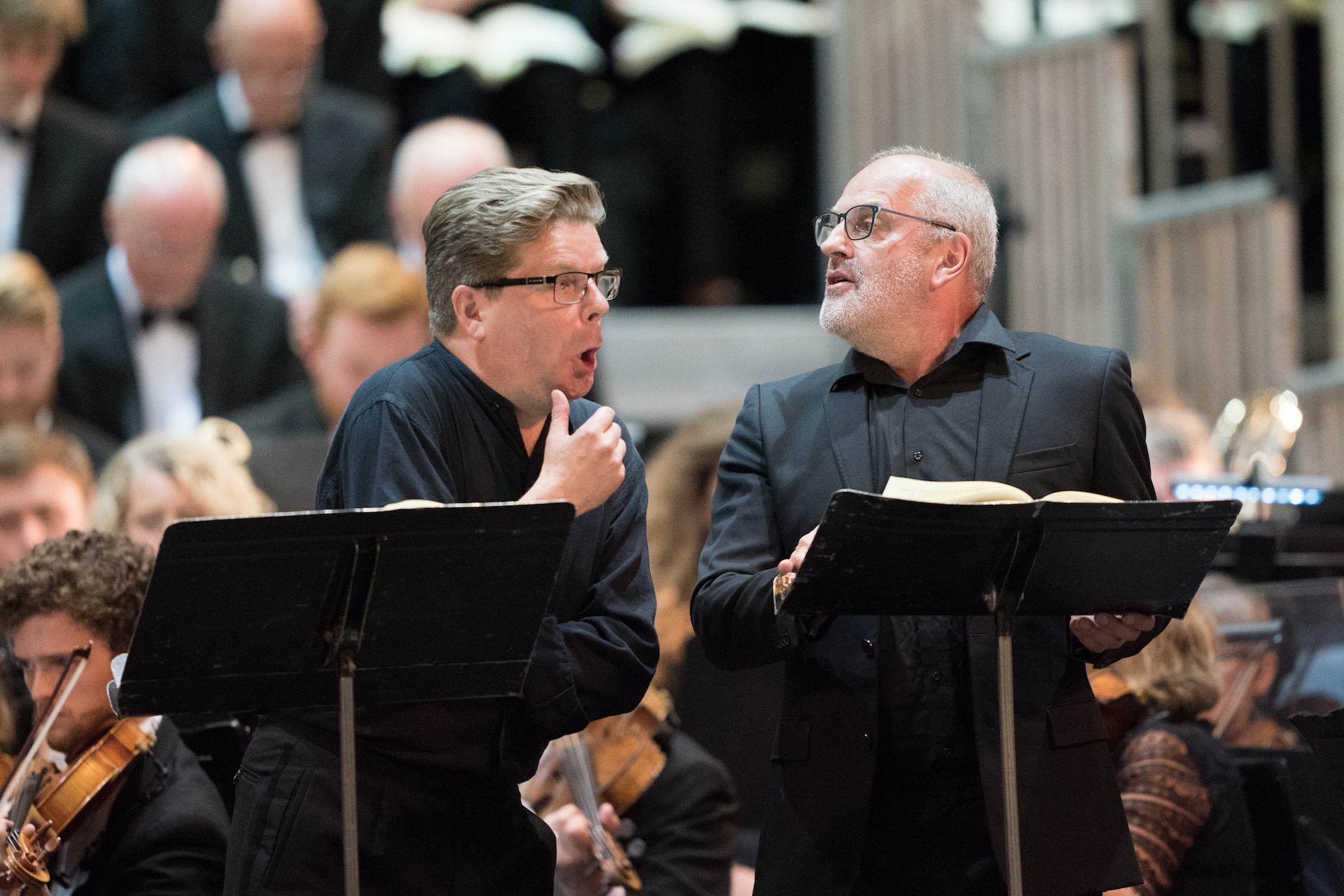 But La Damnation is particularly tough on Faust (never mind his eventual fate). He is there, singing, from bar eight onwards, exposed, high-lying music. Apart from a few tremors in the upper regions, Peter Hoare (pictured above with Christopher Purves) sustained his role beautifully, strong especially in the lyrical flights that are the work’s hallmark and that come from Berlioz’s refusal to set the French language as if it were German. Hoare’s own French was solid; only his hand gestures were somewhat distracting, as if pulling the music out of his mouth.