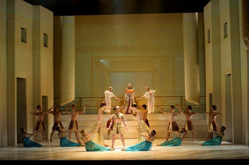 But the real stars of the show are the design team: Christopher Giles (design), Tim Mitchell (lighting) and Nina Dunn (projection design). Together they have produced a wonderfully flexible touring set (main picture, above), which produces all the drama and variation needed for the alternating Roman and Egyptian scenes. We begin in a temple, honey-gold, as Cleopatra prays to the snake god Wadjet (a somewhat stiffly un-snake-like Giuliano Contadini); we then move to a white-washed minimal set, which is enchantingly covered with brightly coloured Egyptianate decorations via projections; the Roman scenes, when Cleopatra has a foreboding vision of doom, shockingly have pillars and walls running with blood. And the final transfiguration, after death, when Cleopatra joins the Egyptian gods in posthumous elevation, is a brilliantly clean white light, with gold and silver shadowings: a really fine design moment that ends the entire ballet on a moment of transcendence.