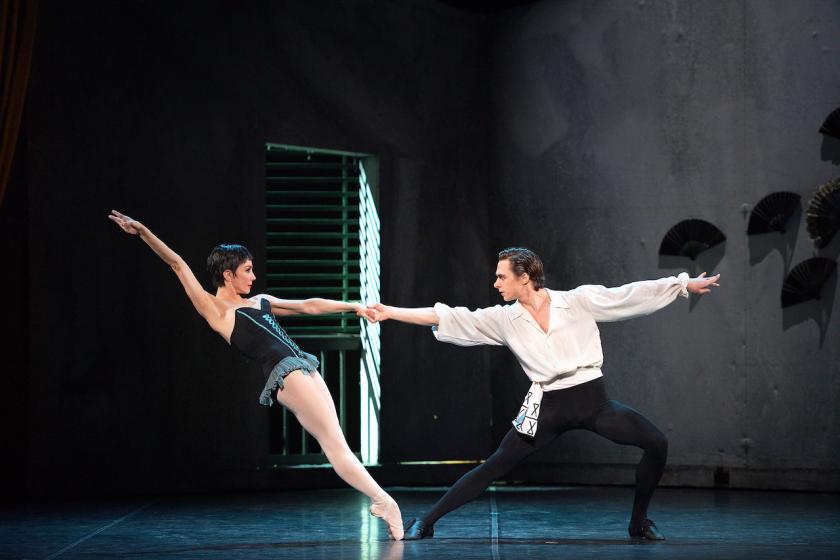 So it went on. In Swansong, savagely percussive music accompanies guards taunting and torturing a prisoner, using explosive tap-dancing (for goodness sake) to powerfully sinister and alarming effect. Then, with the serenity of dawn, the sun-god Apollo demonstrates the pure, simple beauty of Balanchine. There was glorious red and gold stamping and swirling in the Capulets’ ballroom just before the meeting of Romeo and Juliet, an exhilarating highland fling of a reel from La Sylphide, and an irresistibly jolly mazurka from Coppélia. There was a pas de deux from Carmen, using the magical entr’acte at the beginning of Act 3 to unflinchingly erotic effect. And there was so much more, before the first half ended, to audience whoops of appreciation, with William Forsythe’s joyous, exuberant Playlist, created especially for the men of this terrific company.