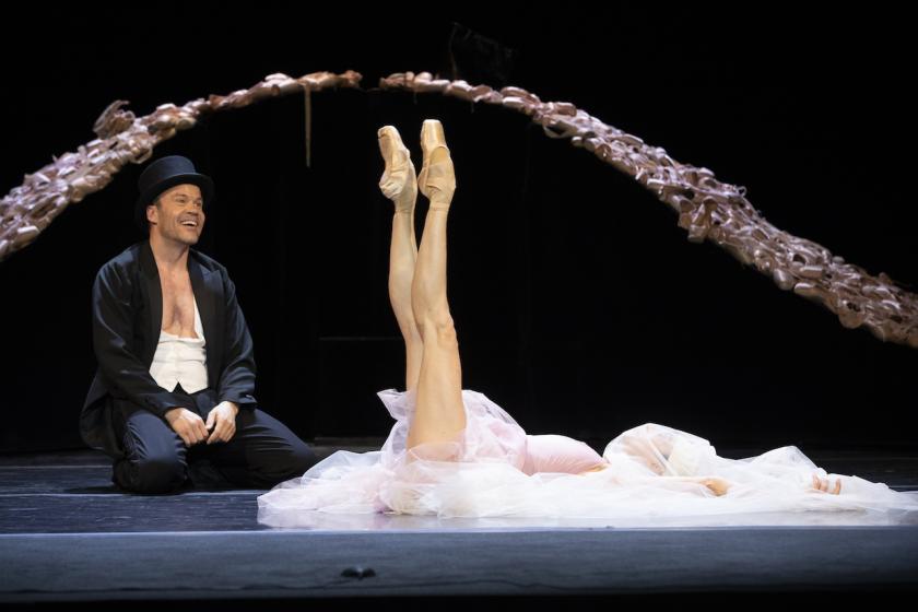 Easing her feet into the shiny new pointes and tying them on, she strips down to a rehearsal tunic and launches into a personal warm-up, lying on her back and stretching her immaculately pointed feet and long, still beautiful shapely legs. It’s at this point that Ferri is joined by bowler-hatted Carsten Jung (pictured above with Ferri), whose character, unlike the original Winnie’s largely absent husband, appears to dote on her, resting his chin goofily on the soles of her flexed feet the better to gaze into her face, or following her on all fours like a dog. But increasingly, as Ferri chatters on, you suspect this tireless admirer to be a mirage, the product of an ex-ballerina’s fantasy, along with the class and rehearsal she is hurrying to be ready for, and the audience whose imagined cheers she receives with a mixture of blushes and pride.
