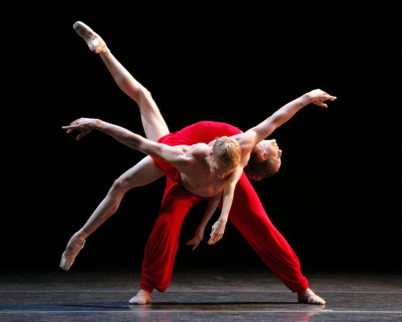 Witty asides release the pressure: a Bach-like fugue decorated by unexpectedly elegant upside-down floor rolls for the girls clutching their pointed feet; a bravura sort of Russian drinking dance for four men with linked arms.
