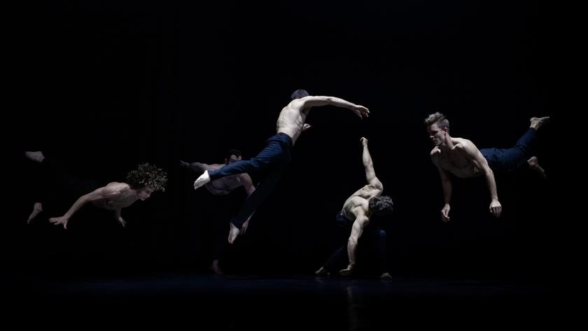 A group of 10 acrobats all in black dart around the stage with breathtaking speed and vigour, coming together and pushing apart in a series of lifts, throws and catches with alarming alacrity. They run, jump and fling themselves at each other at unexpected moments, hurling back layouts at breakneck speed, trusting that someone will be there to catch them, to swing them back around to carry on with the next move. It's very Philippe Decouflé meets Marcel Marceau.