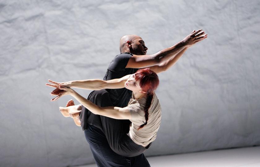 Shikzuka Hariu's set is two enchanting curves of crumpled paper, pure white, which recall rock walls; in this setting and under the frequently very bright lighting of Mikki Kunttu, Khan and Guillem came to seem to me like inhabitants of a sacred mountain, and dancing a vector of the divine encounters that happen in high rocky places, sometimes challenging (like Jacob wrestling the angel), sometimes benedictory (Mohammed receiving revelation from Gabriel), and sometimes both personal and peaceful, as hermits and holy men of all religions have found.