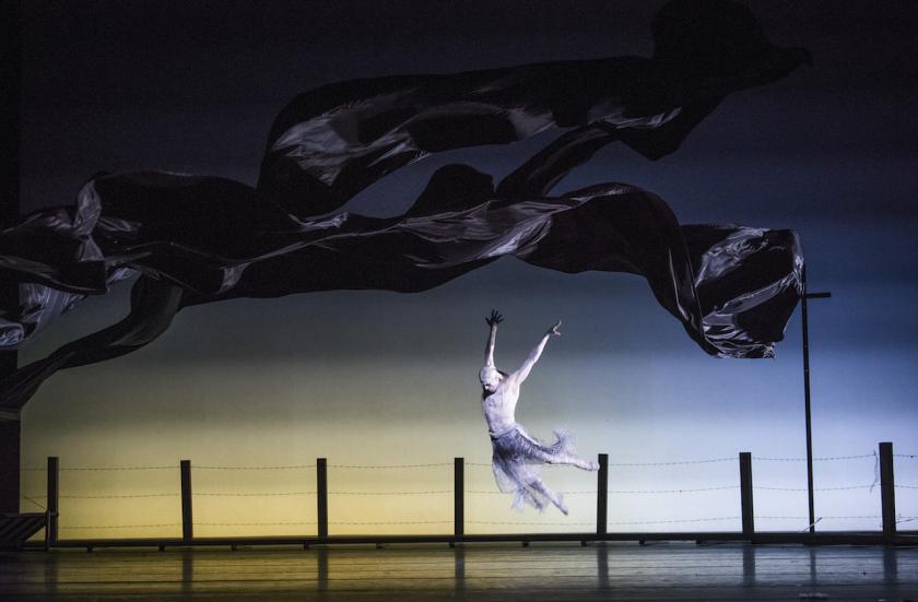 Despite Yann Seabra’s terrific 1880s costumes – including chaps in big hats, cowboy boots and, er… chaps – you know this is not going to turn out like a wordless version of Oklahoma!. The mournful slide guitar in Frank Moon’s big, gruff orchestral score supplies the location and the mood. Jeremy Herbert’s set shows wide skies and wire fencing. The weather is represented by a single giant flag of silver-grey sheeting, blown so taut that scraps of it break off and attach to the fence. The music had to be conceived on a gargantuan scale – the pit is so crowded the orchestra spills out of it – because the prevailing gale makes this a noisy half-hour even before anyone starts dancing in boots.
