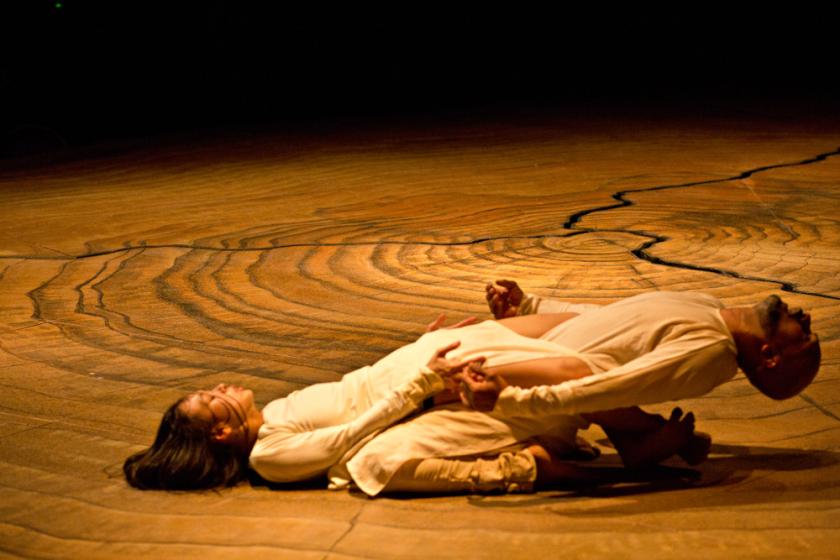 Khan, Naïr, and dramaturg Ruth Little have gone for an impressionistic, rather than an exact retelling of the story; certain moments are clearly identifiable, but at other times it's hard to tell where we are in time, who is playing whom, or what they are supposed to be doing. I will admit to wavering attention during those parts of the piece, but it's never less than a pleasure to soak in the atmosphere created by Khan and collaborators, particularly the set, a stunning use of the Roundhouse space by visual designer Tim Yip and lighting designer Michael Hulls. A round stage decorated to look like a tree stump, with rings and bark, is crossed by crevices, like cracks in stone or in the earth's crust. The floor can shift under the dancers' feet along these crevices; smoke rises and lights shine out of them like subterranean fire; thin bamboo poles are planted in them to look like arrows lodged in flesh, or bare reedy trees.