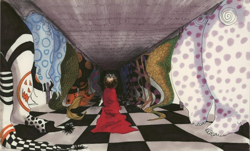 The striped gallery leads to a small, dark chamber containing a surreal, illuminated sculpture of a carousel, which is suspended from the ceiling above a pulsating plasma ball and turns to an eerie theme composed by Burton’s most frequent musical collaborator Danny Elfman. Opposite is the figure of the malign, sack-like Ooogie Boogie from The Nightmare Before Christmas, one of Burton’s scariest bogeymen. The exhibition next takes on a roughly chronological shape, following Burton’s early life in Burbank, incorporating his two years of study at CalArts and his four years as an artist at Disney, before sweeping around to a room containing costumes, props, and figures from his films: Batman cowls, the Penguin’s baby carriage, Ed Wood’s pink angora sweater, Edward Scissorhands’ outfit and, in a courtyard, his reindeer topiary. There are thematic diversions within this—a wall of alien and space creature art, for example—and alarming sentinels, such as the lanky cookie-cutter robot from Edward Scissorhands, the sandworm jaws from Beetlejuice, and the spooky animatronic children from Willy Wonka’s Chocolate Factory.