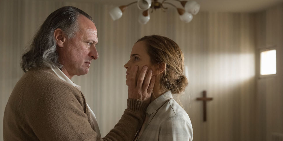 An ambulance whisks Daniel away to be tortured. He's tied to a bedstead, electrocuted and beaten up. Lene discovers from other activists that Daniel is at the mysterious “Colonia Dignidad” (Dignity Colony), a religious cult based in the south. She travels there dressed as a nun in an attempt to get him back. The cult duly admits Lene, who finds the compound run by German immigrants like a religious version of North Korea: the abuse is systematic, the propaganda constant. Paul Schäfer (Michael Nyqvist, pictured above with Watson) brilliantly plays the camp commander, leading the unhappy bunch like a Teutonic Jim Jones. Schäfer uses violence and religious mania to keep the inhabitants in check, leaving him free to abuse the children in his care. In one remarkable scene he attempts to raise a man from the dead.