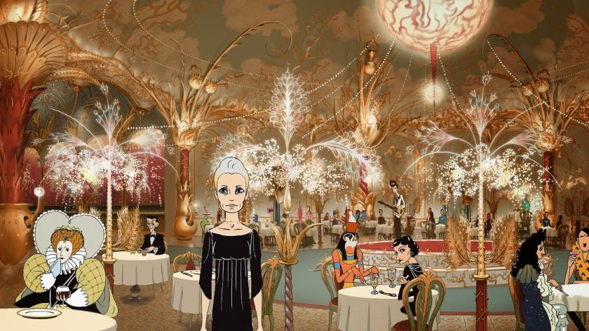 20 years later, Robin’s cyber-self is the star of a popular franchise and she is invited to a swanky Miramount-owned hotel in the desert for a high-powered convention. Once on the grounds, she takes a pill and suddenly everything goes gloriously psychedelic, with live action abandoned for colorful, kinetic, often beautiful animation that’s kind of a cross between Max Fleischer and Peter Max. In this bubble of drugged privilege, everyone presents themselves as whatever screen idol, fantastic creature, or version of themself they want to be. Robin forms a relationship with the animator who’s been working with her scanned image all this time, a John Cassavetes lookalike played by Jon Hamm (though not making him a Jon Hamm lookalike seems like a terrible waste).