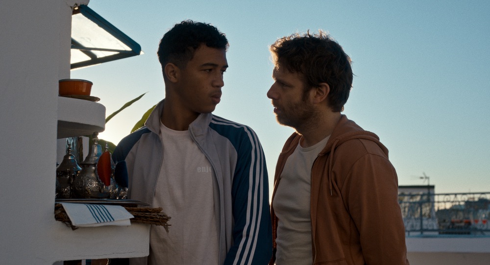 Selim is furious and humiliated to learn that the interviews his mother is always putting on her face for are actually not interviews at all. “You’re sick in the head,” he tells her. But they’re too entwined for him to separate from her. In Tangier, hoping to support them both and keep her quietly at home, he finds concierge work at a luxurious riad owned by the wealthy, white Sébastian (Antoine Reinartz, pictured below with Selim), a gay Frenchman. There's an unsatisfactory plot thread involving Selim and a girl which goes nowhere, but perhaps that's the point.