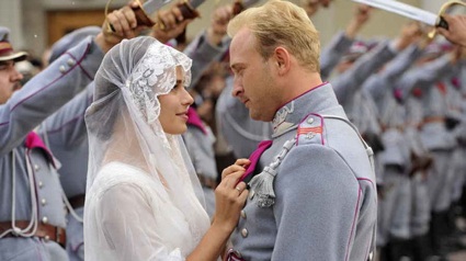 Principle players here are Ola (Natasza Urbanska), star singer in a Warsaw cabaret frequented by writers and military alike, among the former Jan (Boris Szyc). Elements of comedy accompany the elation of living in a free country, but Jan departs from their marriage (Urbanska and Szyc tie the knot, below right) straight off to war. He’s more progressive than some of his compatriots, but it’s a quirk of fate rather than real sympathy for the Reds that sees him, after capture, in the entourage of the invading Soviet army. Ola first believes him dead, and herself joins general enlistment back in Warsaw, learning impressive fighting skills on the front. Will the lovers ever see each other again?