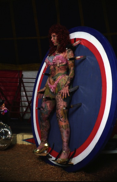 Fenix (Jodorowsky’s handsome son Axel) is confined to a mental hospital. He thinks he’s a bird and, perched naked on a tree trunk, screeches mournfully. Then, in flashback, we witness the traumatic childhood event that led to his breakdown. The Circo del Gringo has pitched its tent in a Mexican town. Fenix (Jodorowsky’s younger son Adan) is the son of Orgo, the knife thrower (Guy Stockwell) and hire-wire acrobat, Concha (Blanca Guerra). Concha catches her husband in flagrante with a tattooed seductress (pictured right) and tosses sulphuric acid over his crotch. He retaliates by slicing off her arms and slitting his own throat, leaving Fenix an orphan – save for the mother inside his head.