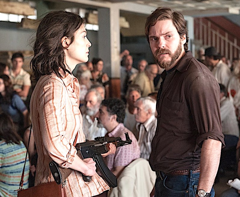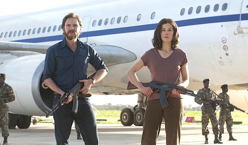 As for Kuhlmann, Pike plays her as an ashen-faced, tight-lipped zealot, growing increasingly manic and bug-eyed as she gobbles handfuls of amphetamines to keep awake during the interminable stand-off. There’s a neat scene where she conducts an imaginary conversation on an airport pay-phone, though the phone line had been cut off (screenwriter Gregory Burke made this bit up, though).