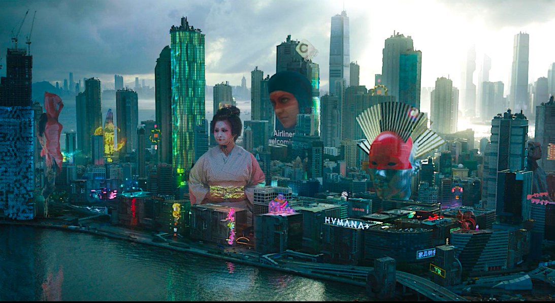 All of this takes place within a dazzling but soulless city, a futuristic dystopia shrouded in an atmosphere of foreboding and run, as far as one can tell, like a military dictatorship (echoes of The Matrix or Robocop or the Terminator movies rumble through the film like distant thunder). Basically it looks like Hong Kong – with recognisable landmarks like the China Bank building – with loads of computer-added extras, including forests of futuristic skyscrapers with huge holographic figures (the shape of advertising to come) walking between them (pictured below). In classic comic-book style there’s also a dark and lawless side of town, where, it turns out, The Major (or Motoko Kusanagi, as she then was) used to hang with a crowd of rebellious, anarchic low-lifes.