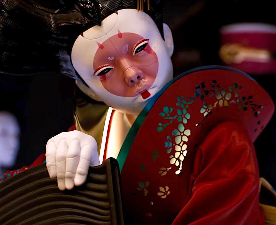 There’s been some controversy about the casting of Scarlett Johansson as the central character, The Major, with some onlookers contending that it’s an outrage to hire a Caucasian superstar instead of a Japanese actress. Others (including Mamoru Oshii, who directed the 1995 Japanese anime version) say the argument is ridiculous, since the story is all about a woman whose consciousness has been transplanted into a wholly synthetic cyborg body, not conforming to any particular nationality (Geisha-bot, below).