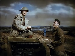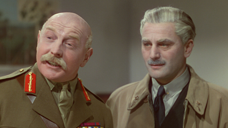 That’s a lot of “isms” already, so one more, High Toryism, won’t go amiss. Traditional conservatism, characterised by paternalism and noblesse oblige, is espoused most completely in Powell and Pressburger’s oeuvre by Clive Wynne Candy (Roger Livesey), Blimp’s upper-class English imperial officer who has to learn the harsh lesson that his honorable way of fighting, based on his experience as a VC-winning subaltern in the Boer War and as a brigadier on the Western Front (Livesey pictured below with John Laurie), is next to useless in the era of Nazism and total war.