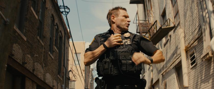 The dinosaur credentials of disgraced cop Frank Penny (Aaron Eckhart) litter his flat, from his battered old TV to his binning of his daily newspaper, bar the sports section. As he begins his beat, vlogger Ava Brooks (Courtney Eaton, pictured below) is blathering wokely about the mainstream media. The appearance of a pair of ruthless but remarkably stupid kidnappers results in Penny’s jaw-dropping decision to let her live-stream his hunt for the kidnap victim, due to drown in 63 minutes in an undisclosed location.