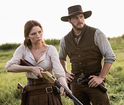 Director Antoine Fuqua (who previously made Training Day and The Equalizer with Washington) is apparently a big fan of Westerns, but while this is a solid effort it wouldn't dream of tearing up the archaic conventions of the genre. Thus, there's a lengthy passage where Chisolm goes through the ritual of recruiting the remaining Magnificent Six, and another set-piece where the lads – Ms Cullen (pictured below with Chris Pratt) being the solitary female in this prairie of testosterone – teach the clueless townsfolk which way round to hold a rifle. There are jocular shenanigans, too, with the Seven's Home Alone-style booby traps for Bogue's henchmen.