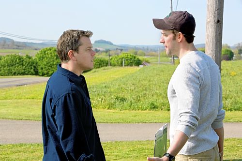 Noticeably, the casting is flawless. Damon plays Steve Butler, the son of a dairy man who feels that fracking can be the answer for the cash-strapped farmer. Visiting various households, he and his partner, Sue Thomason (Frances McDormand), make offers on behalf of their corporate employer to buy the land under certain farms. As a friendly new face, Steve reassures the locals that he is, in fact, just like them and that the money fracking promises can, say, send a child to a good school. Frank Yates (Hal Holbrook) is one farmer who is less than convinced. Cue the appearance of smart-mouthed, smooth-talking environmentalist Dustin (John Krasinski, pictured below with Damon) who not only pees in the pool of Steve and Sue’s buying plans but also nabs the attractive female teacher that Steve had marked out as his own. The plot develops into a nail-biter: which side the community will follow and, separately, who is telling the truth?
