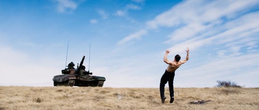 The broad message is that life goes on, that tricks and clowning in the ring are an assertion of life, in a context of death; it's qualified by the fact that the circus patriarch (Rene Bazinet, himself a performer and teacher with Cirque du Soleil: most of the other cast also have circus backgrounds) is himself dying. And there is real risk out there, as when a single tank rumbles over the horizon, to be farcically engaged with the matador-like antics of the troupe’s fire-breather (main picture); the comedy that comes when the tank responds with its own show-off pirouettes is very quickly dissipated when a warplane screams over, and blows it to smithereens, as the absurd very quickly turns to horror. But then it’s back to the magic of the big top for a splendid final riff on the sheer life-affirming power of performance (image above).