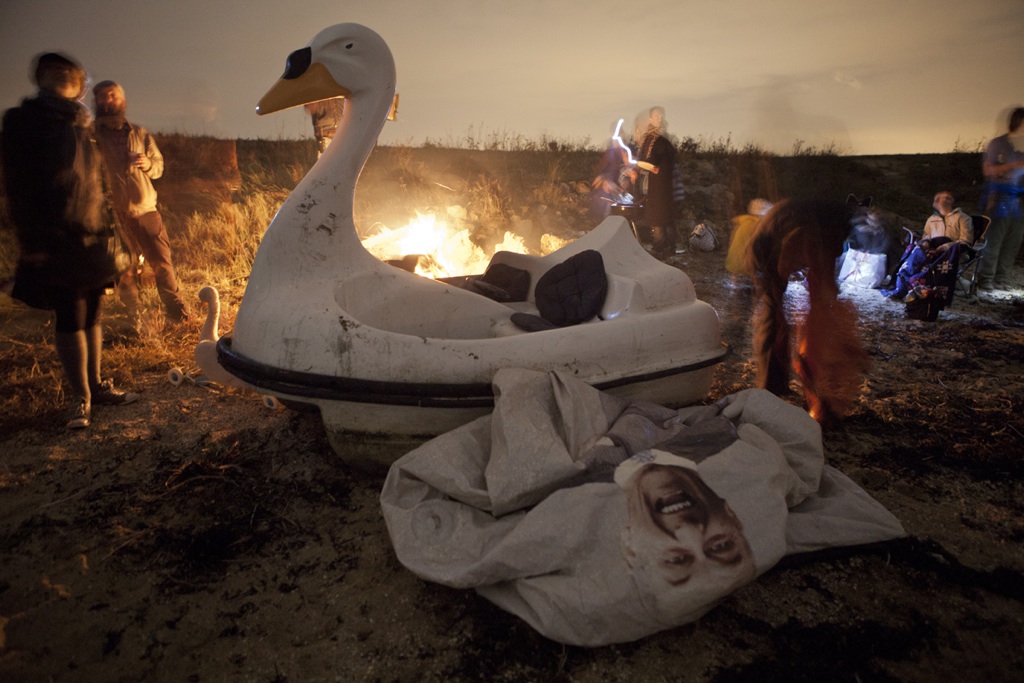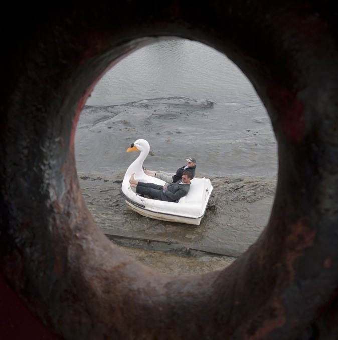 Continuing alone, Kötting crashes into the barrier erected around the Olympic site, deliberately setting off an alarm and the loud hailer alert: “all alien craft away from the Olympic site”. Yet he concludes that the journey wasn’t about lodging an official complaint, but “was about the ridiculousness of pedalling a swan-shaped pedallo from Hastings to Hackney and spending a whole month in the same clothes.” If only…I would have enjoyed that film.